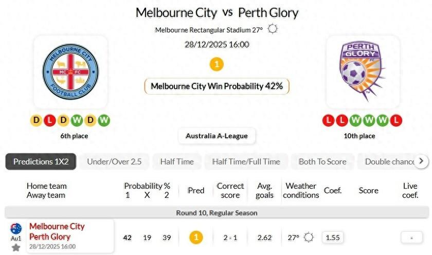 墨爾本城最近6次在澳超主場對陣珀斯光榮的比賽中保持不敗