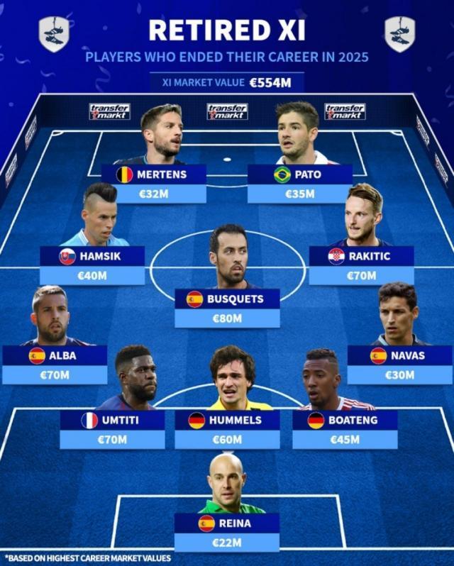 12月28日訊 德國轉會市場列出了2025年退役球員陣容,布斯克茨、拉基蒂奇、阿爾巴、帕託在列。