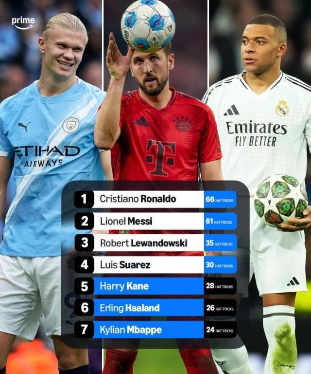 21世紀戴帽次數榜:C羅66次居首,梅西61次第二