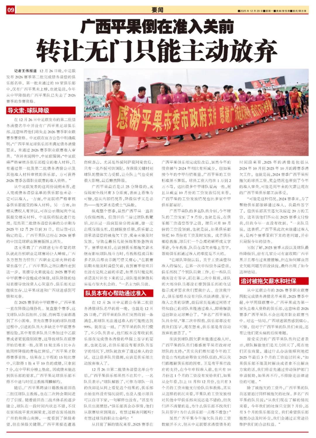 從中足聯公佈的2026賽季職業聯賽兩批完成債務清償名單來看,2025賽季中超、中甲兩級聯賽中,廣西平果成爲第一家失去准入資格的俱樂部,這意味着2026賽季廣西平果隊不會出現在職業聯賽當中。對這一結局,廣西球迷固然感到痛心、可惜,但對於廣西平果的隊員們來說,還有讓他們更頭痛的後續難題。
