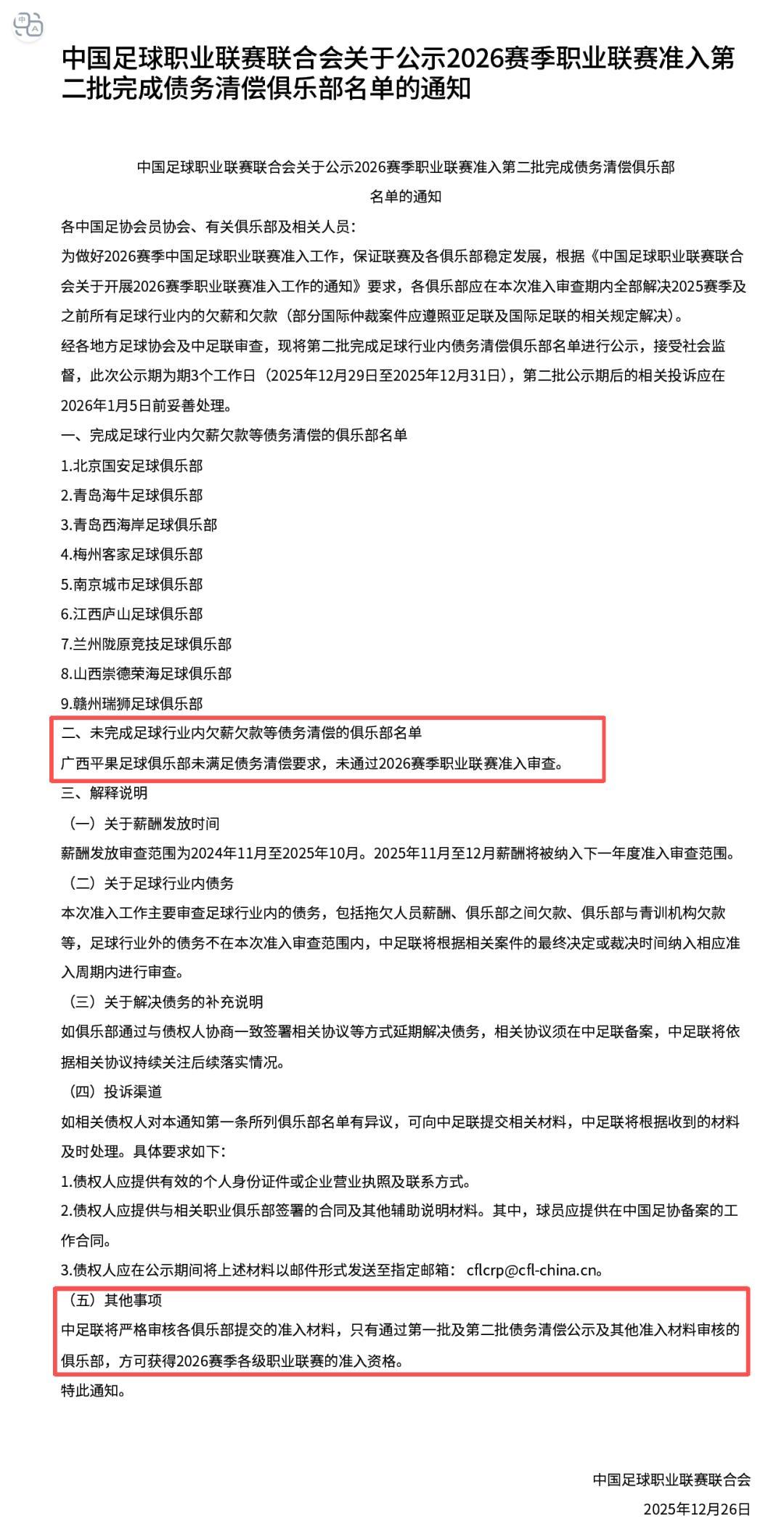 在12月26日中足聯發佈的第二批債務清償名單中並沒有廣西平果足球俱樂部,這意味着他們將失去2026賽季職業聯賽參賽資格。中足聯在官方公告中明確載明:“廣西平果足球俱樂部未滿足債務清償要求,未通過2026賽季職業聯賽准入審查。”在補充說明中,中足聯強調:“中足聯將嚴格審覈各俱樂部提交的准入材料,只有通過第一批及第二批債務清償公示及其他准入材料審覈的俱樂部,方可獲得2026賽季各級職業聯賽的准入資格。”