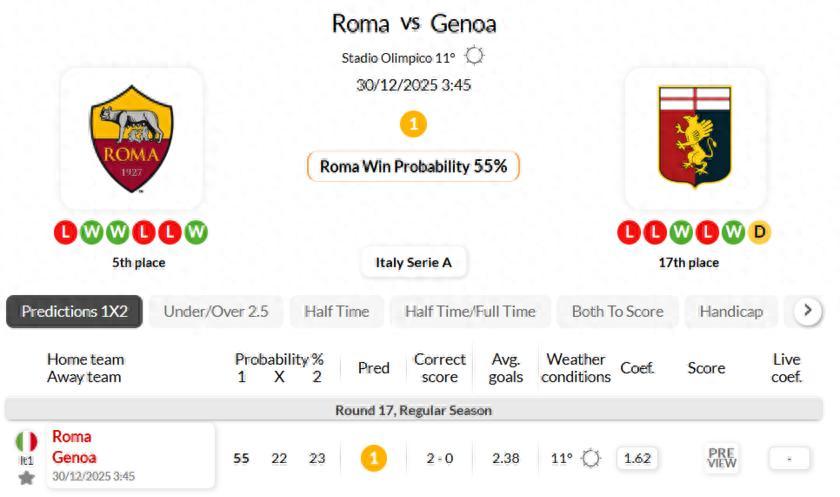 羅馬在意甲最近17場主場對陣熱那亞的比賽中,半場未嘗失利