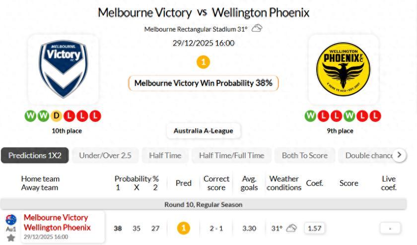 墨爾本勝利隊在最近12場主場對陣惠靈頓鳳凰的澳超聯賽比賽中未嘗敗績