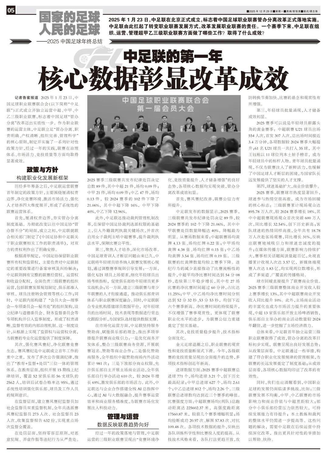 記者魯蜜報道 2025年1月23日,中國足球職業聯賽聯合會(以下簡稱“中足聯”)正式成立並獨立運營中超、中甲、中乙三級職業聯賽,標誌着中國足球“管辦分離”改革邁出實質性一步。作爲職業聯賽的運營主體,中足聯立足“管辦分離、職責明確、產權清晰、組織完善、管理科學”的核心原則,制定並實施了一系列針對性政策方針,經過一年的實踐,聯賽在治理體系、市場活力、競技質量等方面均取得顯著成效。