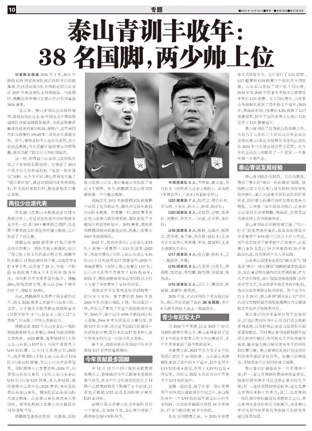 2025年度,正式序列的7支各級國家隊,泰山青訓貢獻了高達38名國腳,其中8人跨年齡段入選上一級國家隊。