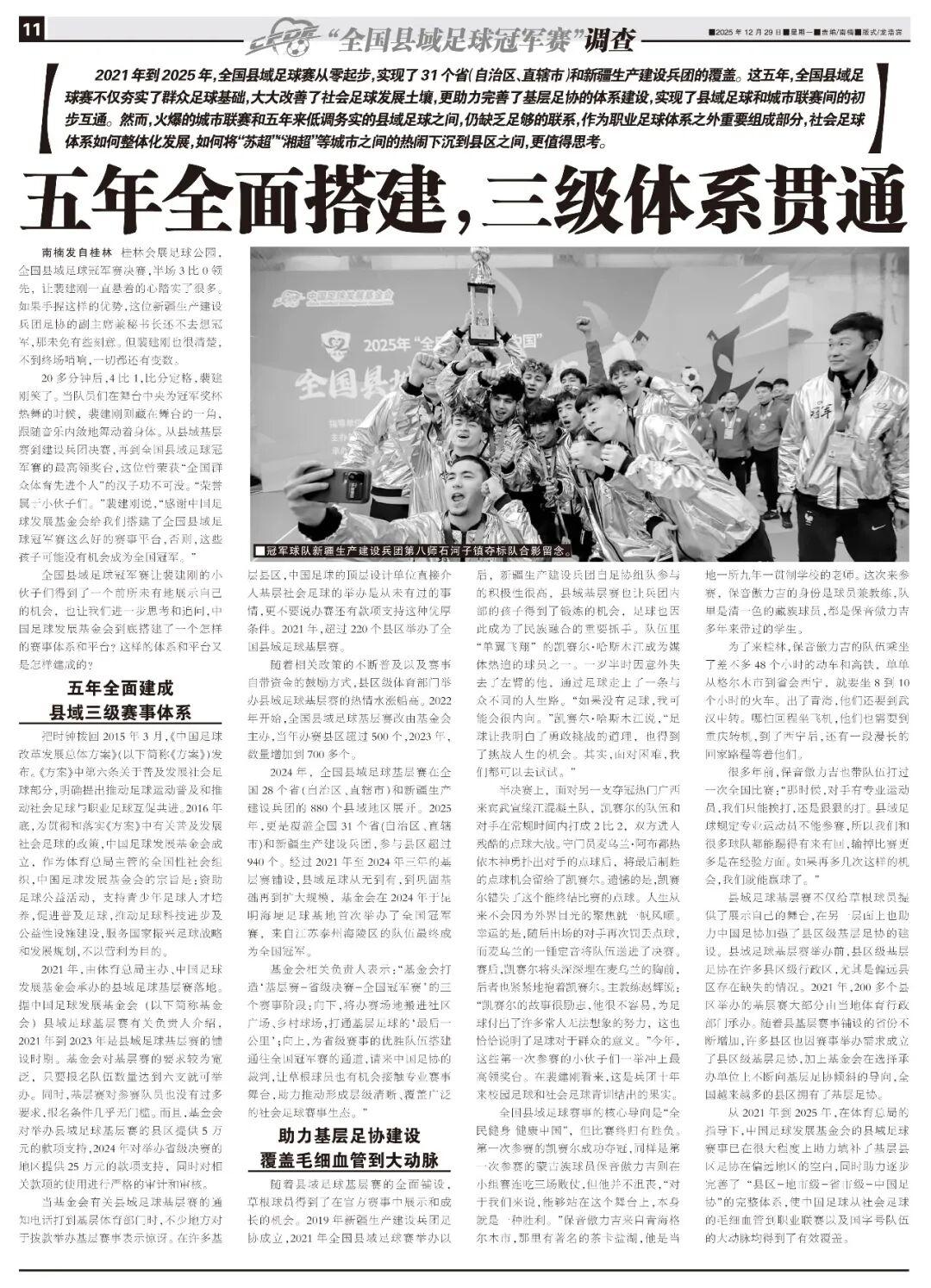 從2021年到2025年,在體育總局的指導下,中國足球發展基金會的縣域足球賽事已在很大程度上助力填補了基層縣區足協在偏遠地區的空白,同時助力逐步完善了“縣區-地市級-省市級-中國足協”的完整體系,使中國足球從社會足球的毛細血管到職業聯賽以及國字號隊伍的大動脈均得到了有效覆蓋。