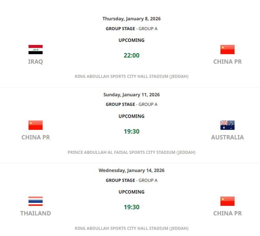從賽程角度看,中國隊首戰將於1月8日面對伊拉克,1月11日次戰澳大利亞,最後1月14日對陣泰國。這樣的安排意味着球隊可能需要從相對較強的對手身上爭取積分,才能在最後一輪掌握主動權。
