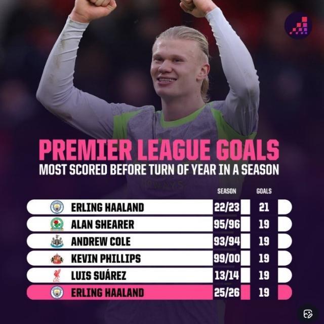 12月31日訊 2025年英超戰罷,數據網站OPTA也盤點了英超歷史在新年之前射手榜,其中本賽季哈蘭德19球並列次席,紀錄也由自己保持。