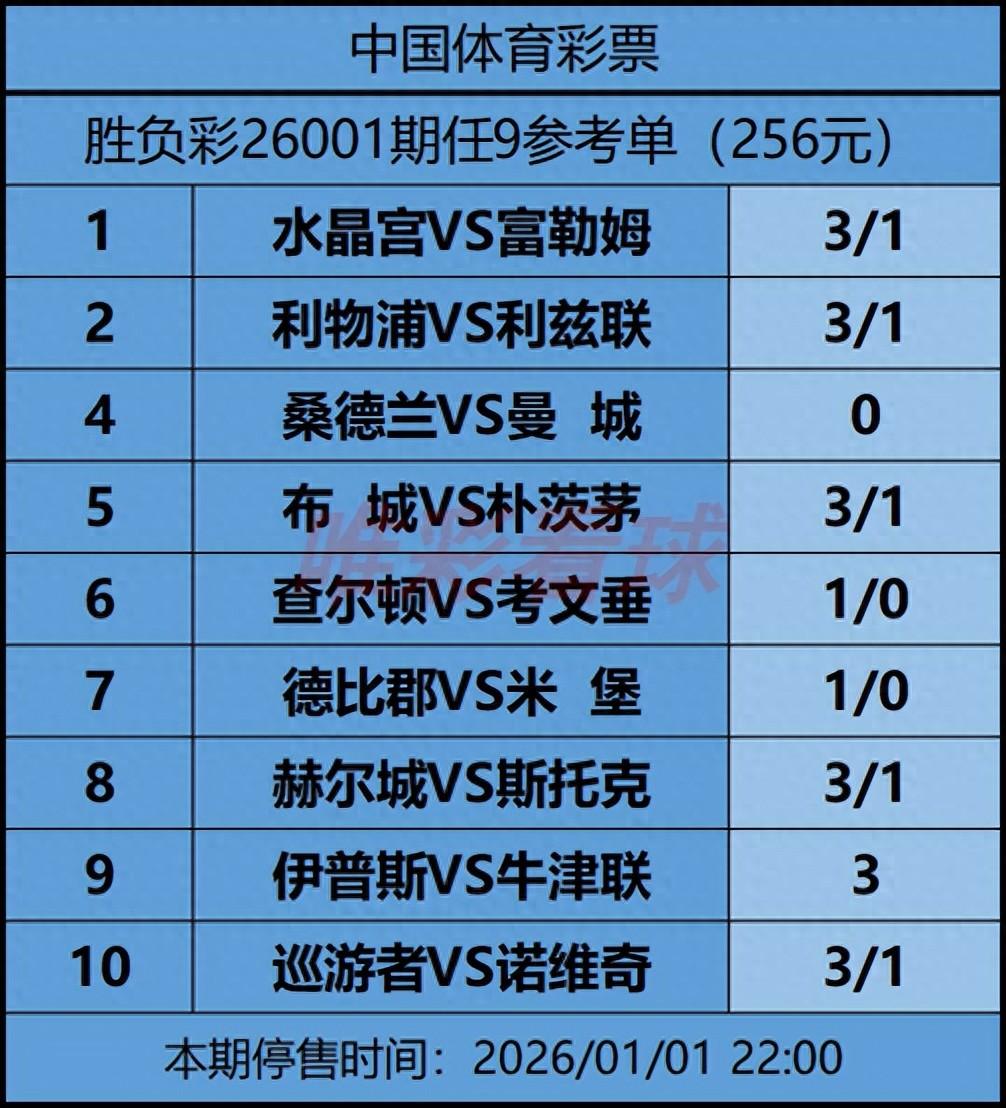 金石開:今天是2026年第一期勝負彩,也在祝廣大的彩民朋友新年快樂、彩運亨通!目前正處於英系賽事聖誕、新年快車中,所以本期勝負彩也是全面競猜英超和英冠的賽事。本期英超場次是第十九輪的最後四場,有利物浦和曼城這兩個膽材候選。曼城本輪做客對陣本賽季黑馬桑德蘭,機構給出1.41的客勝指數,這是本期僅高於頭號膽材伊普斯維奇的指數,可見外界對曼城的客勝前景還是相當看好。近期曼城三線豪取八連勝,勢頭相當生猛,但桑德蘭同樣不容低估,近期聯賽2勝3平1負,惟一的失利就是12月6日在客場0比3不敵曼城。那麼這場比賽,曼城能在二十多天後客場完成對桑德蘭的雙殺嗎?
