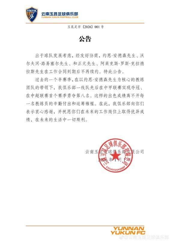 出於球隊發展考慮,經友好協商,約恩·安德森先生、沃爾夫岡·路易塞爾先生、和正元先生、阿萊克斯·羅斯·克拉德拉斯先生在工作合同到期後不再續約。特此公告。