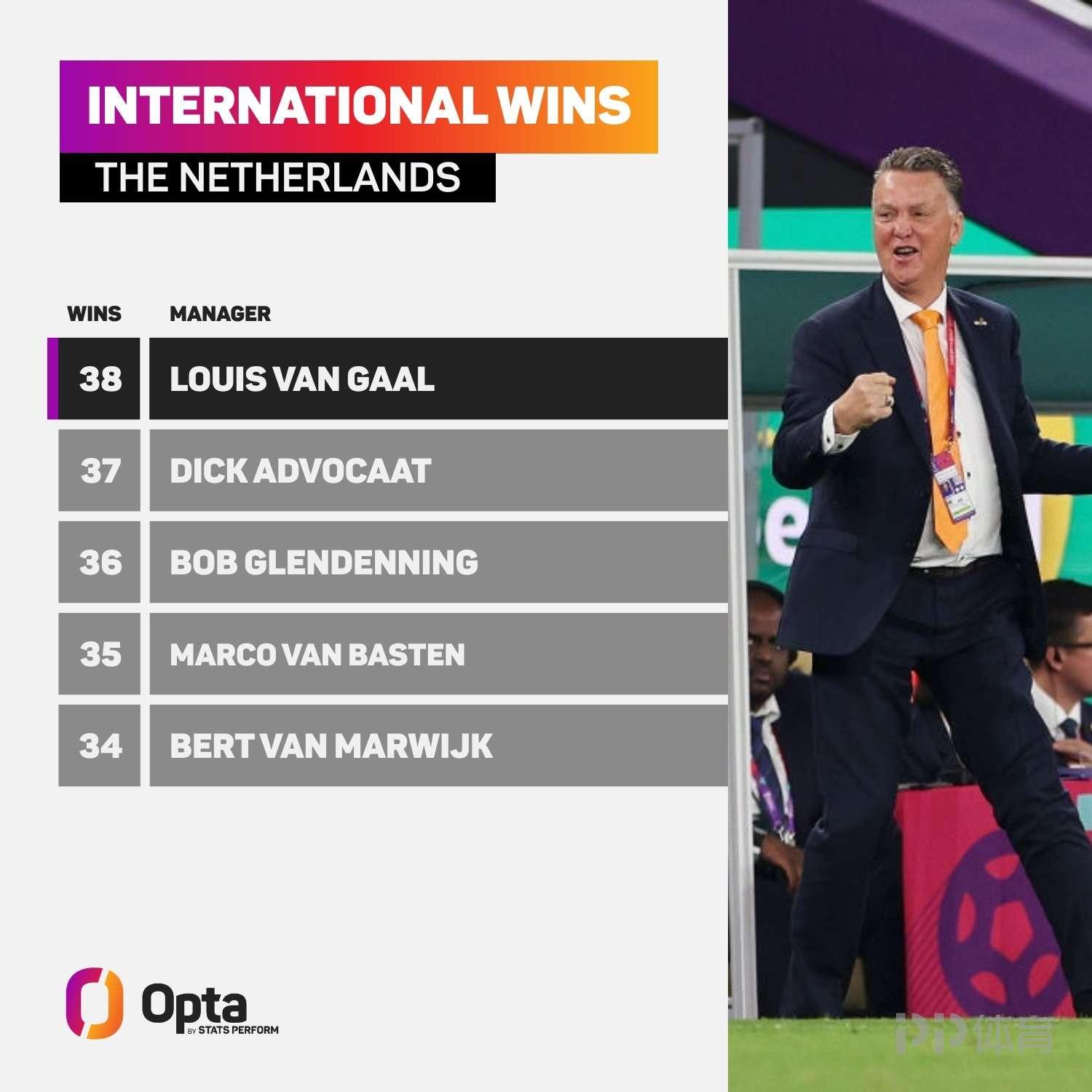 世界盃小組賽第1輪,荷蘭2-0戰勝塞內加爾。根據opta統計,在這場比賽過後,範加爾成爲執教荷蘭隊贏球場次最多的主帥。