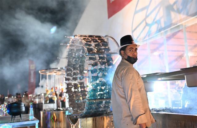 延布營地中心區的空氣從下午4點多起就漂浮着誘人的烤肉味兒,跨年之夜的晚餐自然是要整點硬通貨的。果然,夜幕降臨,“好客的沙特”帳篷前鼓樂聲響起,伴隨着音樂的節奏還有節奏感很強的歌聲,音樂與歌聲把延布營地的跨年氣氛從天黑一直延續到凌晨——