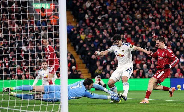 2天后要奔赴倫敦連戰富勒姆和阿森納,面對客場防守稀鬆的利茲聯(此前客場比賽全部有丟球),斯洛特繼續將小傷在身的維爾茨放在了前場偏左的位置,畢竟上輪對壘狼隊,德國人就在這個角色上幹得不錯。開場階段,維爾茨和埃基蒂克的呼應也的確不少,法國前鋒首次射正被盧卡斯·佩裏撲出後,第二次內切選擇找到小禁區邊緣的維爾茨,但後者跟進推射被封堵。眼見客隊三中衛守得腹地密不透風,利物浦由瓊斯等人逐漸增加外圍發炮,孰料本方禁區卻險些被偷襲得手。阿利松幾乎沒有難度的出球直接送到安帕杜腳下,好在後者也沒做足射門準備,掄了一腳也是回傳力度。