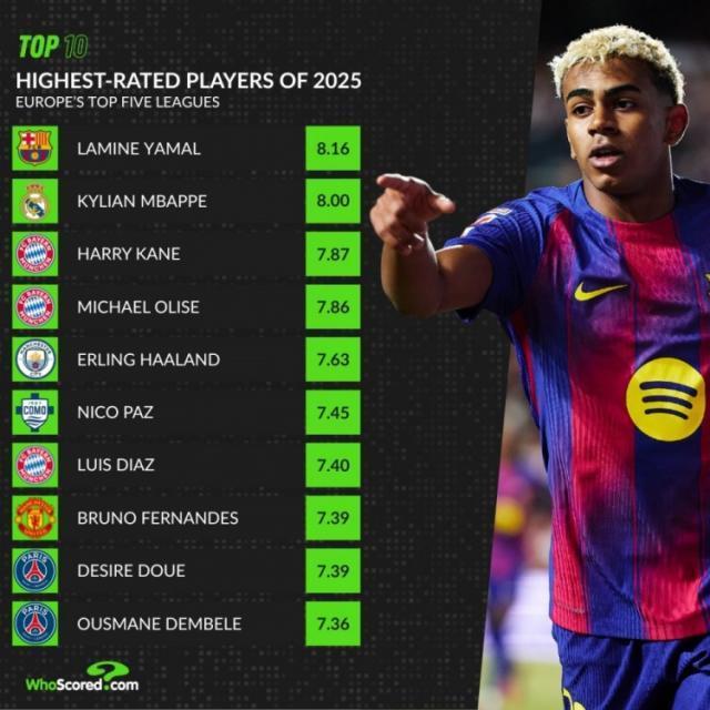 whoscored統計了2025年五大聯賽場均評分榜,亞馬爾力壓姆巴佩居首。whoscored2025五大聯賽評分榜: