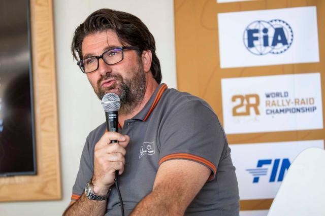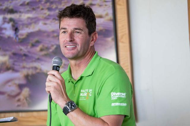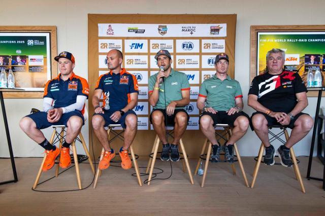 回到當下,2日下午的三場新聞發佈會是僅次於賽員大會的重頭會。第一場是達喀爾新的重要贊助商——英國著名汽車品牌Defender(路虎廠商)專場,除了廠方代表出席,代表廠商隊出征Stock組(量產組)比賽的達喀爾先生彼德漢塞爾也蒞臨現場。隨後,國際汽聯代表和大衛·卡斯特拉同時召集了國際汽聯越野拉力錦標賽的新聞發佈會。達喀爾傳奇車手西班牙人馬克·科馬,作爲摩洛哥站的賽事負責人出席了這次發佈會。2025達喀爾拉力賽摩托車組冠軍桑德斯等車手作爲嘉賓出席。科馬的發言即將結束時,主持人拋出一個讓科馬競猜2026摩洛哥站冠軍的問題,久經沙場的科馬顯然不會當着衆冠軍給出答案。