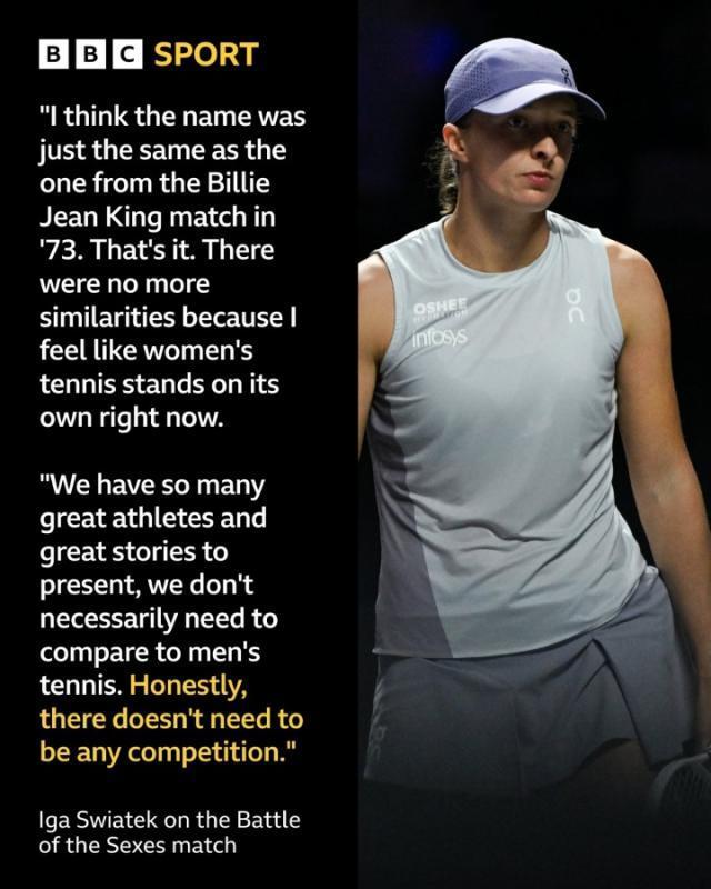 近日在迪拜舉行的網球性別大戰中,女單世界第一薩巴倫卡3比6、3比6不敵現男單世界排名第671位的前溫網男單亞軍克耶高斯。對此現女單排名世界第2的斯瓦泰克給出了自己的看法,她表示:“不,我沒看過,因爲我不看這類東西。那是娛樂節目,但我認爲它與社會變革或任何重要議題都無關。我想它的名字只是和1973年比利·簡·金的比賽一樣罷了,僅此而已,沒有更多相似之處。因爲我認爲女子網球現在本身就足夠出色。我們有這麼多偉大的運動員和精彩的故事可以呈現,沒必要和男子網球作比較,那是完全不同的歷史。