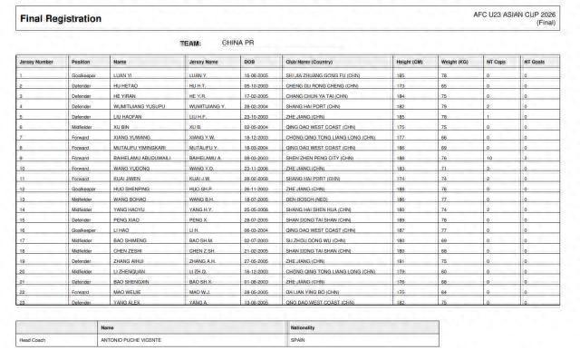 中國U23國家隊征戰2026年U23亞洲盃大名單: