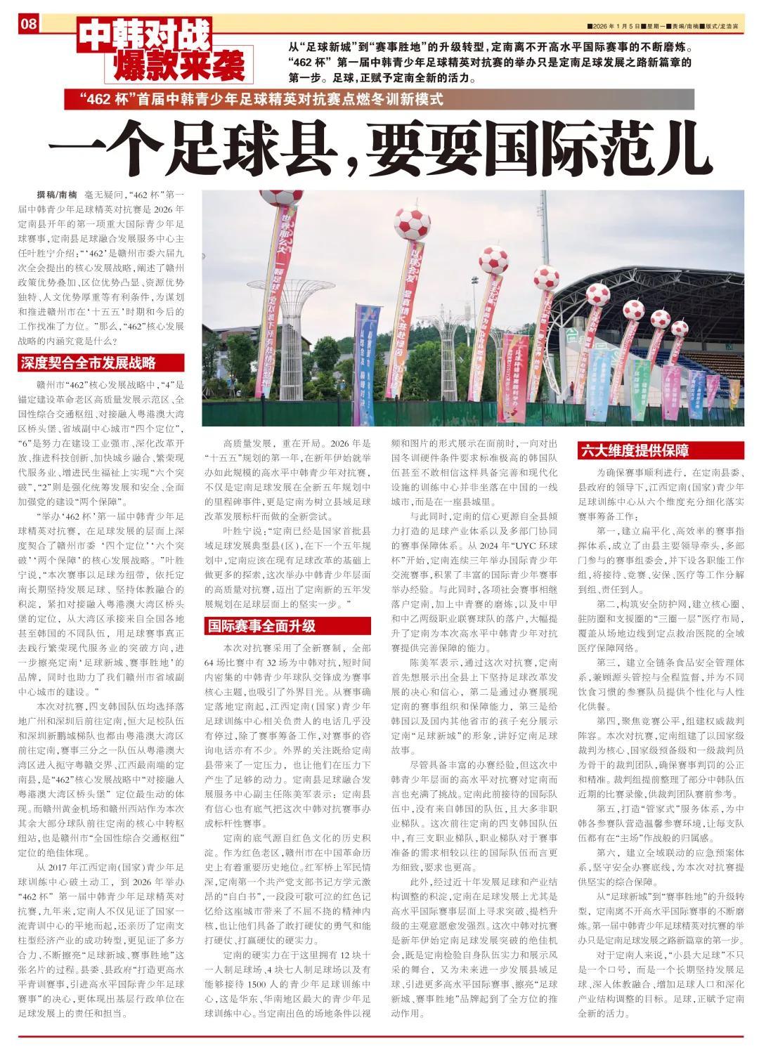 撰稿/南楠 毫無疑問,“462杯”第一屆中韓青少年足球精英對抗賽是2026年定南縣開年的第一項重大國際青少年足球賽事,定南縣足球融合發展服務中心主任葉勝寧介紹:“‘462’是贛州市委六屆九次全會提出的核心發展戰略,闡述了贛州政策優勢疊加、區位優勢凸顯、資源優勢獨特、人文優勢厚重等有利條件,爲謀劃和推進贛州市在‘十五五’時期和今後的工作找準了方位。”那麼,“462”核心發展戰略的內涵究竟是什麼?
