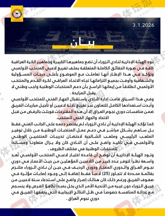 扎瓦拉俱樂部在聲明中還稱,“先前,我們曾與伊拉克足協進行過多次溝通,並提出了多種解決方案。其中一項是:伊拉克足協推遲扎瓦拉隊的聯賽賽程,以確保球員能夠前往U23國足報到,同時也不影響球隊自身的成績。但在三天一輪的賽程下,伊拉克足協不同意我們的聯賽延期方案,因爲再往後根本無法安排補賽。所以,我們只能選擇拒不放人。而且,我們並不擔心會受到處罰,因爲國際足聯和亞足聯都不會因爲非國際比賽窗口期拒絕放隊員參加國家隊比賽而實施處罰。”