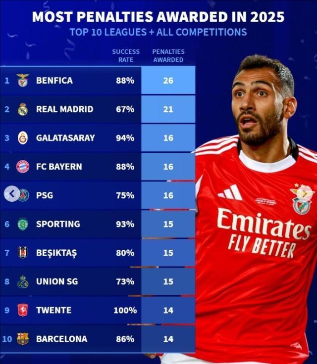 2025年俱樂部獲得點球排行:本菲卡26個居首,皇馬21個,巴薩14個