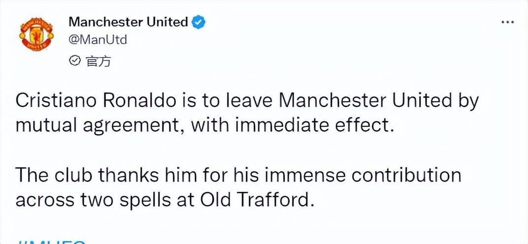 曼聯官方通告:“在雙方同意的情況下,C羅跟曼聯的合同提前終止,立即生效。俱樂部感謝他在老特拉福德的兩段時間所做出的巨大貢獻。”
