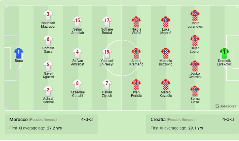 摩洛哥(4-3-3):布努;馬茲拉維、賽斯、阿格爾德、阿什拉夫;阿馬拉、阿姆拉巴特、歐納希;鮑法爾、恩-內斯里、齊耶赫