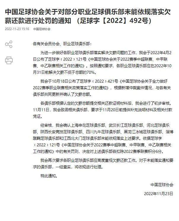 在公告中,中國足協解釋了相關的背景:爲進一步做好各職業足球俱樂部落實解決欠薪問題的工作,我會於2022年4月2日公佈了足球字﹝2022﹞121號《中國足球協會關於2022賽季中超聯賽、中甲聯賽、中乙聯賽相關工作的通知》。按照通知要求,各職業足球俱樂部應在2022年10月31日前解決欠薪不低於總額的70%。