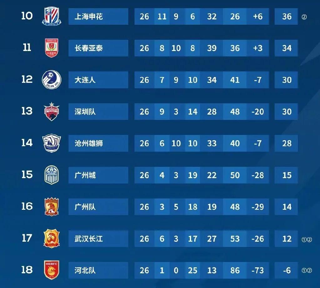 中超方面,申花被扣3分後,積分由42分變爲36分,排名由第8名下降爲第10,但離降級區依舊較遠;積分榜後4位的球隊排名,發生了重大變化。