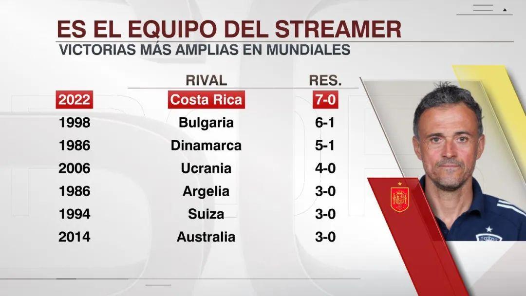 7比0的比分,也是西班牙自1934年首次參加世界盃以來,單場最大分差的贏球紀錄,巧合的是,此前的紀錄(1998年世界盃小組賽6比1保加利亞),現任西班牙主帥恩裏克還曾作爲球員參與並進了球。不過,當年西班牙是在小組已經出局背景下輕裝上陣擊潰對手,這次則是首戰即顯示了強大的爭冠實力。