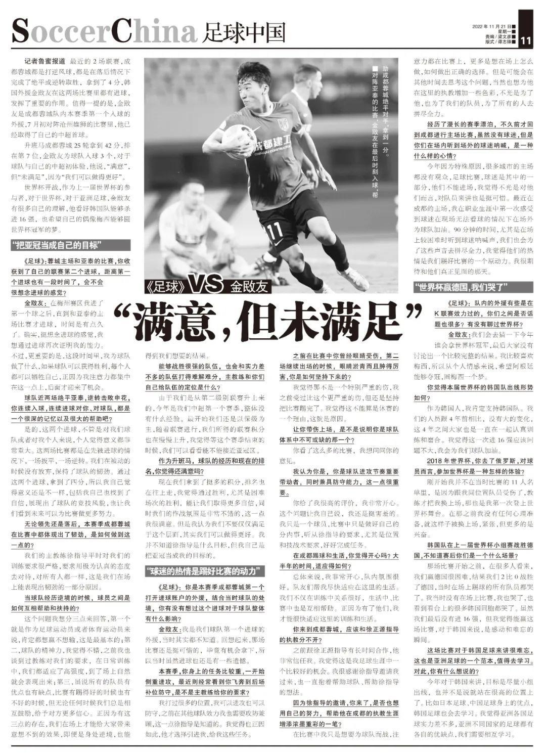 升班馬成都蓉城25輪拿到42分,排在第7位,金敃友爲球隊入球3個,對於球隊與自己的中超初體驗,他說,“滿意”,但“未滿足”,因爲“我們可以做得更好”。