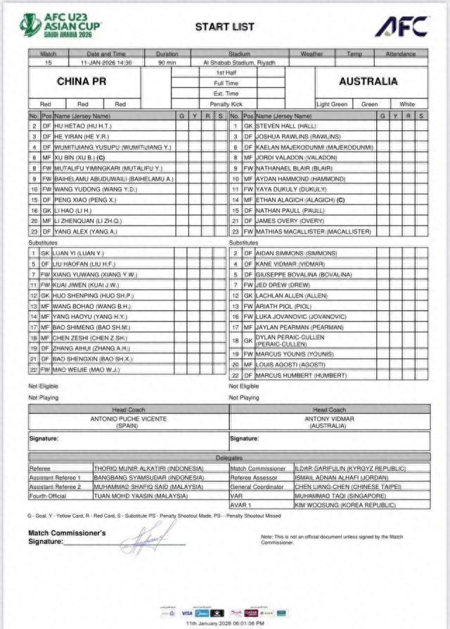 澳大利亞U23首發:1-斯蒂文·霍爾、3-羅林斯、6-馬耶科杜米、15-內森·波爾、21-奧弗裏、8-瓦拉東、14-阿拉吉奇、11-杜庫利、10-哈蒙德、23-馬蒂亞斯·麥卡利斯特、9-布萊爾