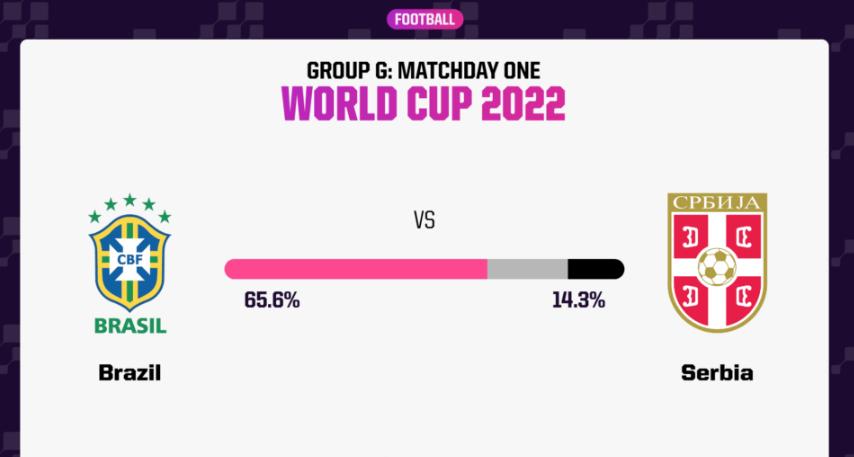 巴西取得開門紅的概率達到65.6%,而首輪爆冷輸給塞爾維亞的可能性爲14.3%。