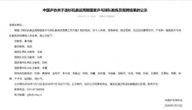 體壇週報全媒體發佈北京時間1月12日,中國乒乓球協會官網發佈了《中國乒協關於洛杉磯奧運週期國家乒乓球隊教練員競聘結果的公示》,秦志戩當選國乒總教練,肖戰任副總教練。具體崗位安排如下:總教練:秦志戩副總教練:肖戰國家隊男隊主教練:王皓國家隊女隊主教練:馬琳國家青年隊男隊主教練:劉彬國家青年隊女隊主教練:李鷺其他崗位教練員:杜朋、黃海城、金鳳宇、李大成、李振山、劉恆、劉曦、劉志強、馬俊峯、邱貽可、任浩、申超、孫遜、王建軍、王雪松、吳顥、徐輝、於子洋、趙渤際、鄭長弓。