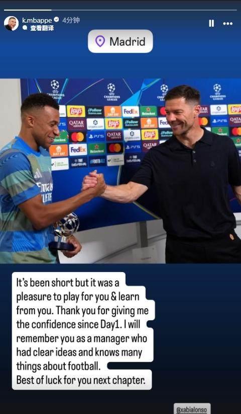皇馬官宣阿隆索下課,姆巴佩在社媒發表動態與阿隆索告別。姆巴佩寫道:“雖然時間短暫,但能爲您效力並向您學習,我感到非常榮幸。感謝您從一開始就給予我的信任。我會永遠記住您是一位思路清晰、對足球瞭如指掌的教練。祝您在人生的下一個階段一切順利。”
