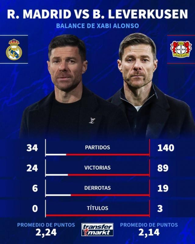 皇馬主帥阿隆索下課,德國轉會市場列出阿隆索執教勒沃庫森、皇馬的數據,並作出對比。