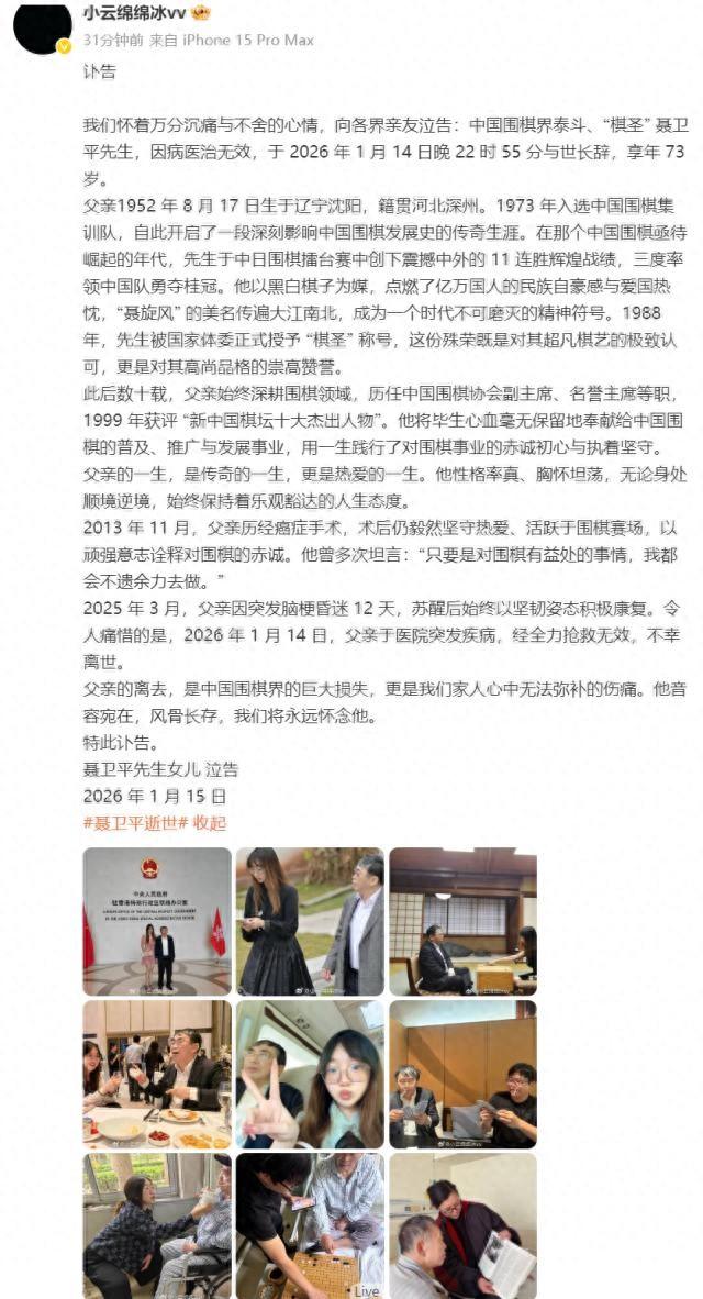 我們懷着萬分沉痛與不捨的心情,向各界親友泣告:中國圍棋界泰斗、“棋聖” 聶衛平先生,因病醫治無效,於 2026 年1月14日晚 22時55分與世長辭,享年73歲。