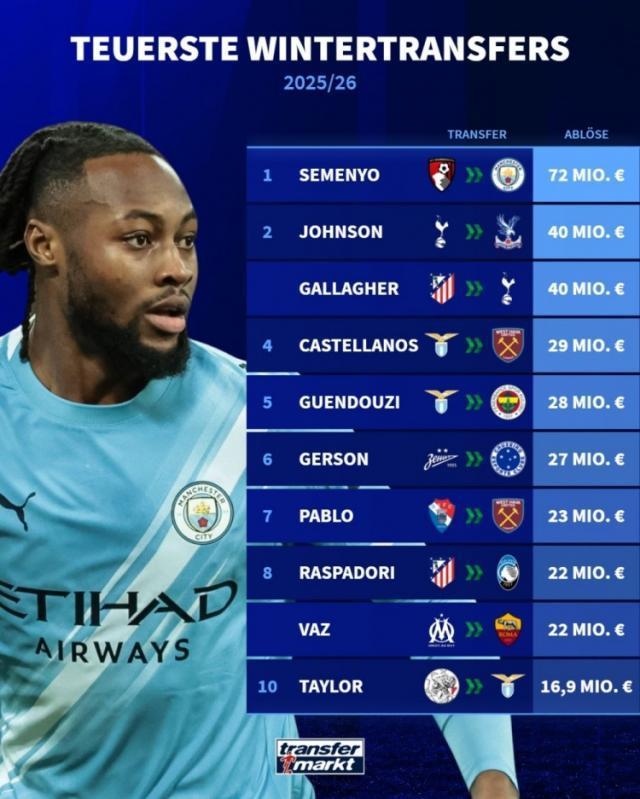 2025-26賽季冬季轉會窗已經開啓大約半個月時間,德國轉會市場盤點了球員的轉會費情況,塞梅尼奧7200萬歐最高,布倫南·約翰遜和加拉格爾均4000萬歐並列次席。以下爲2025-26賽季冬窗球員轉會費排行: