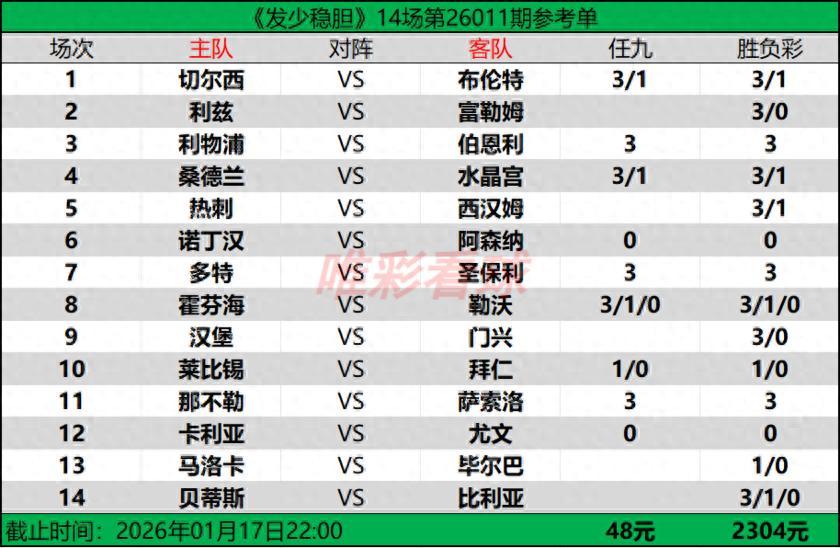 【發少穩膽26011期勝負彩14場(2304元)任九(48元)推薦方案】