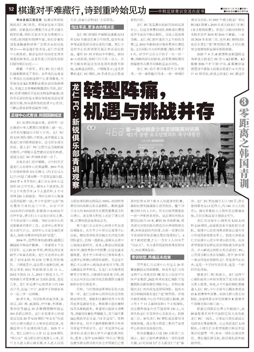 距離定南數百公里之外的海口,由韓國足球名宿李同國擔任技術總監的龍仁FC一線隊,正在進行俱樂部成立後的首次季前集訓。在定南的龍仁U15梯隊,小球員們也希望能像同樣在中國集訓的前輩一樣,未來一圓職業球員夢想。擺在他們面前的,依舊是機遇和挑戰並存。