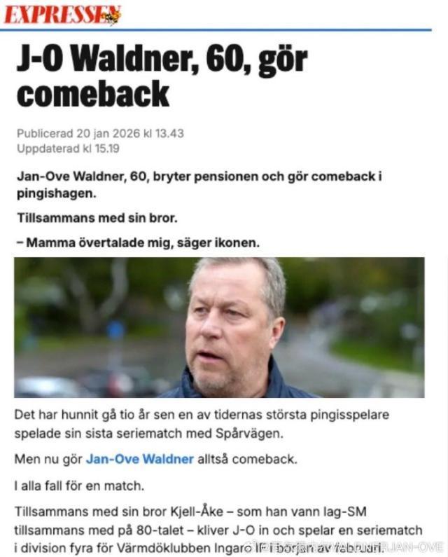 1月21日訊 60歲的瑞典乒乓球名將瓦爾德內爾宣佈,自己將復出回到賽場,他將參加瑞典丁級聯賽(第四級別)英加略對陣布奧的比賽,代表英加略俱樂部出戰。談到本次復出的原因,瓦爾德內爾寫道:媽媽想再看到我們兄弟倆一起打球,我們兄弟倆都很愉快地同意了。被問到是否還能征戰瑞典乒乓球頂級聯賽,老瓦回答:“頂級聯賽的難度大多了,球速快、節奏緊,不僅需要出色的體能,還得打大量的比賽保持狀態。如果要打頂級聯賽,我得先減掉六七公斤體重,把體能練上去纔行,但我現在實在喫不消這些。”
