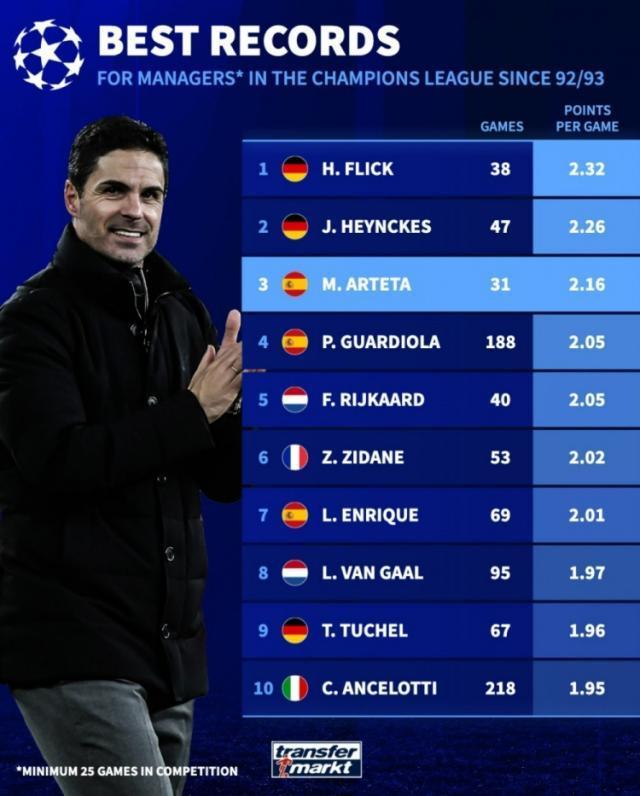 歐冠改制後主帥場均積分榜:弗裏克居首,阿爾特塔第三,瓜帥第四