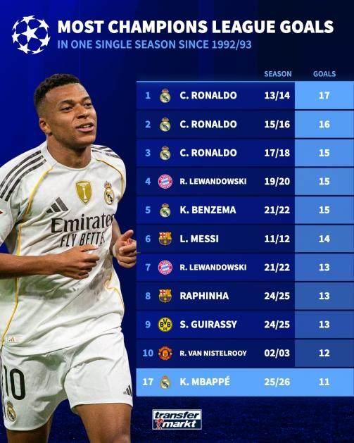 姆巴佩本賽季歐冠6場11球,距C羅紀錄還有6球