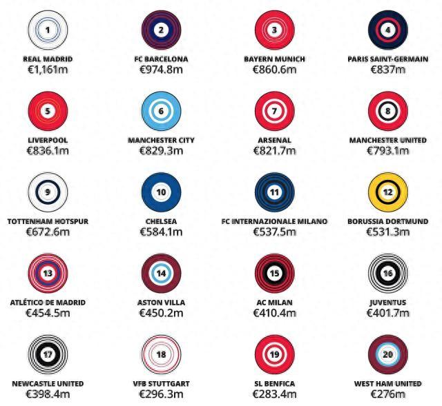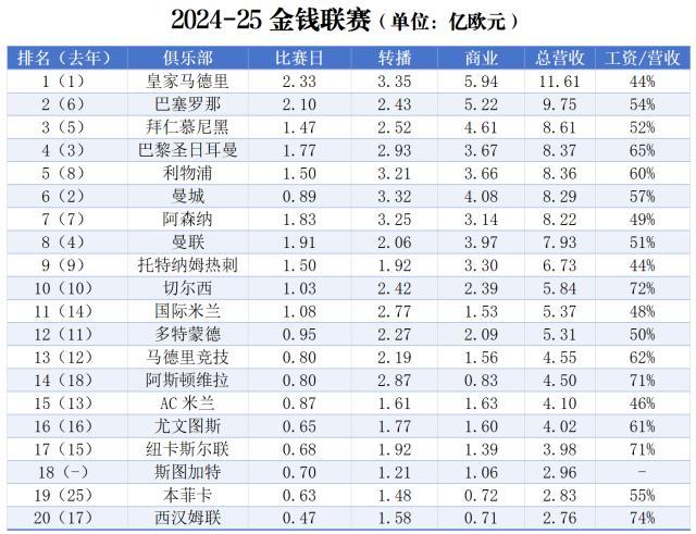 1月21日,德勤會計師事務所發佈2024-25賽季金錢聯賽報告,收錄了上賽季世界足壇營收金額前20名俱樂部(以下簡稱“二十強”)的財政數據。