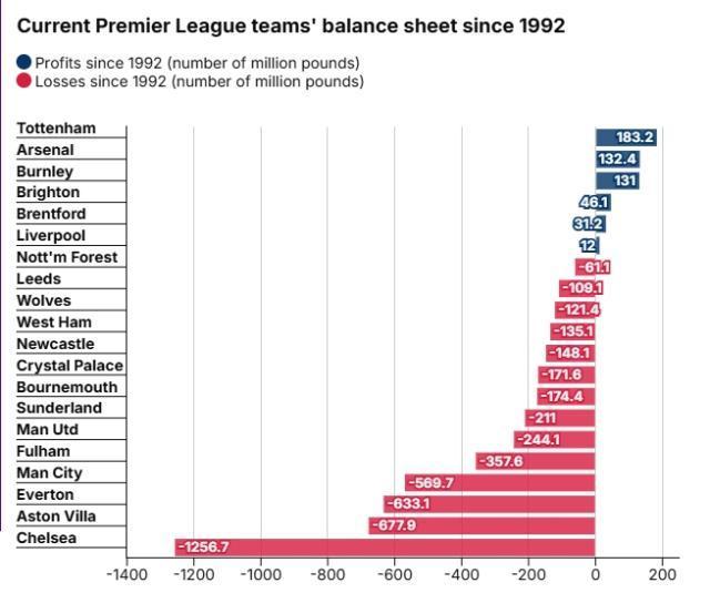 據《郵報》報道,英超時代各俱樂部累計虧損總計已超49億鎊,只有熱刺、阿森納和利物浦等隊實現盈利。自1992年以來,英超俱樂部總共虧損達到了49.9億英鎊,其中90%由10傢俱樂部貢獻。切爾西是虧損最多的,他們英超時代的虧損超12億英鎊,主要在阿布時代。此外,維拉虧損了6.779億鎊,埃弗頓虧損6.331億鎊,曼城虧損也達到了5.697億鎊。曼聯虧損爲2.441億鎊。自1992年以來,曼城每虧損2600萬英鎊就能贏得一座獎盃,切爾西每虧損4500萬英鎊就能贏得一座獎盃。熱刺盈利最多,但他們在此期間只贏得了兩座聯賽盃和一座歐聯杯。如果你以可持續的成功來衡量一個俱樂部,那麼阿森納就是最可以昂首挺胸的俱樂部。 他們曾三次捧起英超獎盃,此外還贏得了九座足總盃、一座聯賽盃和一座歐洲優勝者杯,總共盈利1.324億英鎊,盈利僅低於熱刺。利物浦的運營一直保持穩健,並且實現了1200萬鎊盈利。1992年以來英超球隊盈虧排行:
