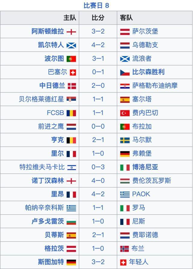 歐聯杯聯賽階段第8輪賽果