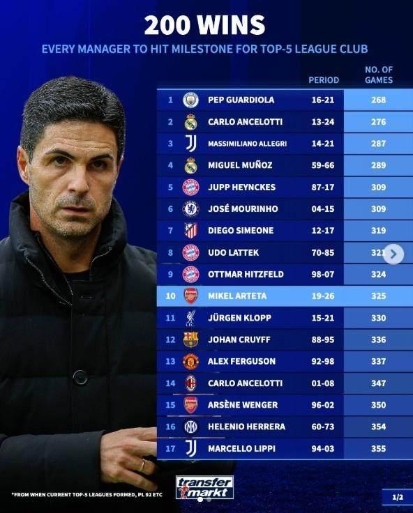 阿森納主帥阿爾特塔在英超中已經拿到了200勝,德國轉會市場盤點了五大聯賽主帥單一俱樂部達成200勝所用場次情況,瓜迪奧拉268場最少,阿爾特塔325場躋身前10,所用場次少於克洛普。以下爲具體排名情況: