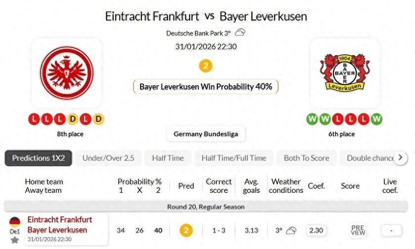在與法蘭克福的近13場各項賽事交鋒中,勒沃庫森均能取得進球