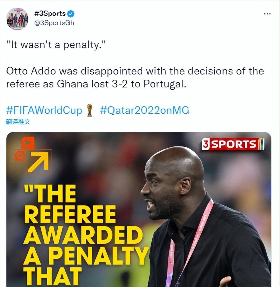 賽後,加納主帥奧托·阿多接受媒體採訪時說:“裁判判罰了一個根本不存在的點球,我相信每個人都是這麼認爲的。我無法解釋爲什麼VAR沒有介入,就是因爲他是C羅?還是有其他原因。我認爲,那是C羅對我們的球員犯規。如果他不是C羅,我不確定裁判會不會做出不同的判罰。”