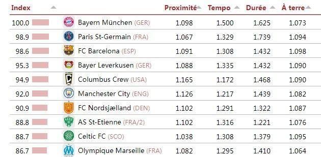 知名數據評測機構足球天文臺(CIES)基於合作伙伴Impect的數據,結合58個主流聯賽公佈了全球最具“控球主導、傳控風格”的球隊排名,拜仁以100分的基準分登頂榜首,巴黎巴薩分列二三位。數據核心排名標準通過以下四項技術指標綜合評定:傳球距離(越短越好)、控球階段的傳球速度、平均單次控球時長,以及在前場三分之一區域,膝蓋以下接球的百分比。排名第一的拜仁獲得了100分的綜合評分(即其他球隊以拜仁的100分作爲綜合指標),巴黎、巴薩作爲二、三名分獲98.9和98.6分。第4-10名分別爲:勒沃庫森(德甲)、哥倫布機員(美職聯)、曼城(英超,92分)、北西蘭(丹麥超)、聖埃蒂安(法乙)、凱爾特人(蘇超)、馬賽(法甲)。11-20名分別爲:布拉加(葡超)、博德閃耀(挪超)、吉達聯合(沙特聯)、皇馬(西甲,84分)、哈馬比(瑞典超)、聖地亞哥(美職聯)、錫爾克堡(丹麥超)、利物浦(英超,81.9分)、洛杉磯FC(美職聯)和埃爾切(西甲)