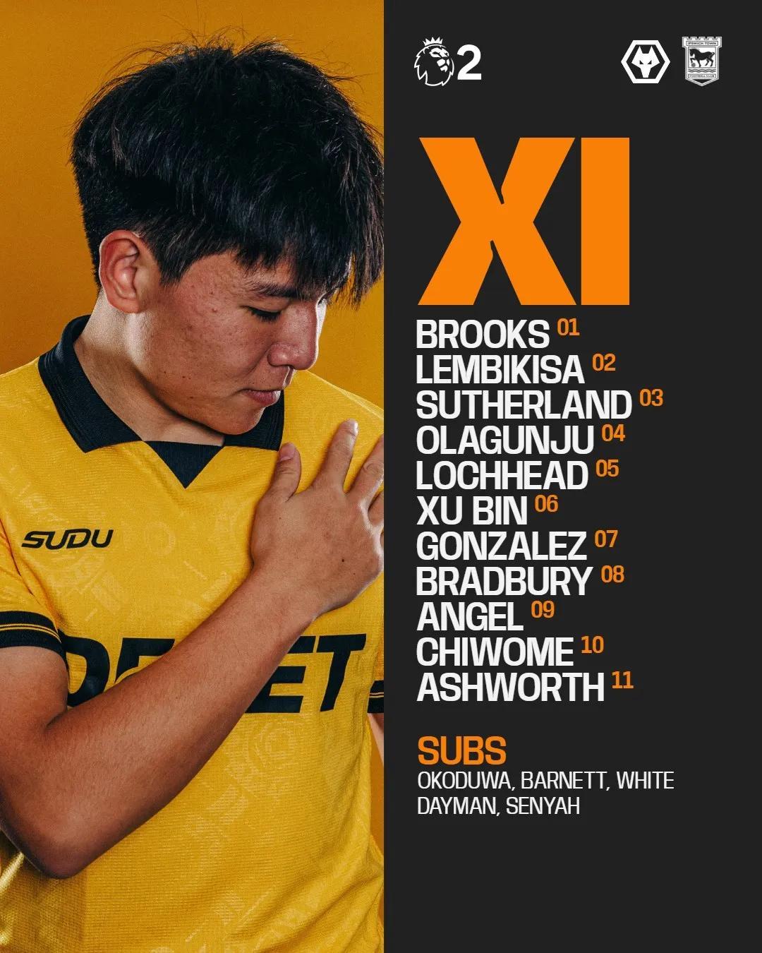 狼隊對徐彬的首秀足夠重視,賽前首發名單海報以徐彬爲主角,徐彬身穿6號球衣出場,比賽還吸引了一些中國球迷到場觀戰。此役對手是英超2聯賽排名第4的伊普斯維奇U21隊,實力很強。而且還有小雨,比賽天氣條件並不理想。但徐彬沒有怯場,很快進入狀態。開場2分鐘徐彬高位上搶,迫使伊普斯維奇U21隊後場傳球失誤,隊友安赫爾吊射迎來夢幻開局。第27分鐘狼隊岡薩雷斯攻入第3球后,徐彬也與進球隊友擊掌慶祝。